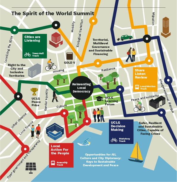 There are 4 main tracks at the World Summit, each track designed to foster the dialogues, to guide the debate and exchange process that will take place throughout the Summit, and to produce specific outcomes. UCLG core values of geographical and gender balance have been taken into consideration wherever possible.